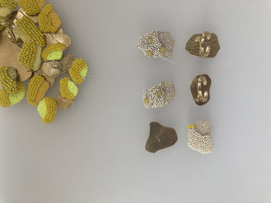 フランス、イタリア、チェコ、インド、ミャンマー、インドネシア、ケニアなどの18世紀から20世紀に生産されたアンティークビーズ。生成りの布や草木染めを施した布に、京都で生産している糸やデッドストックの糸。