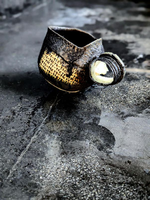 写真のマグは黒釉で施釉し漆で仕上げたもの。一つとして同じものがない中田ワールドをお楽しみに。